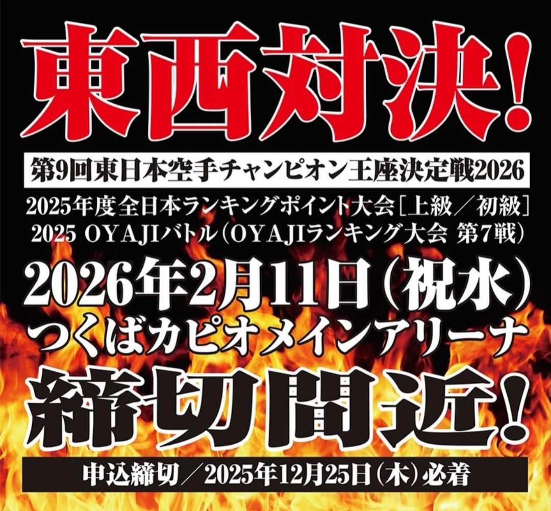 第9回東日本空手チャンピオン王座決定戦2026及び、2025OYAJIバトル(OYAJIランキング大会第7戦)が同時開催されます‼